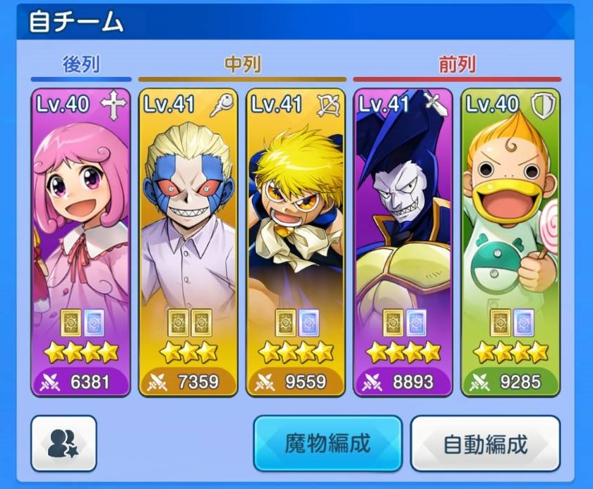 この例ではたまたま全ての型から1体ずつ選出していますが、紹介した通り防御型と支援型が1体ずつ、その他の魔物が3体という構成となっています。