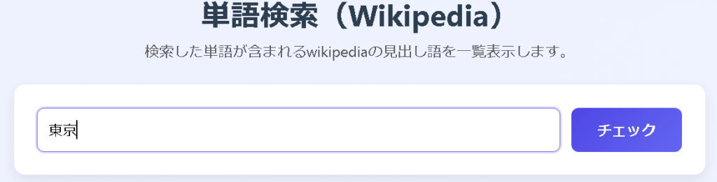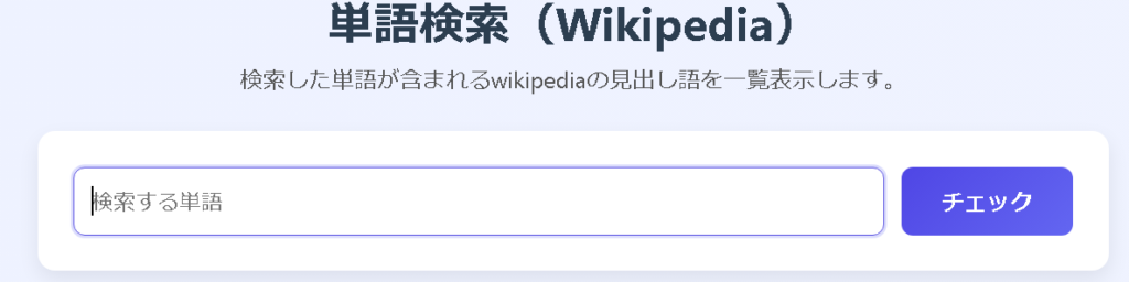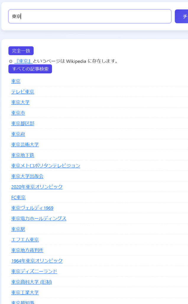 単語がwikipediaの記事にあるかを検索できます。完全に一致しなくても、検索したい単語が含まれる記事名を一覧で確認できます。